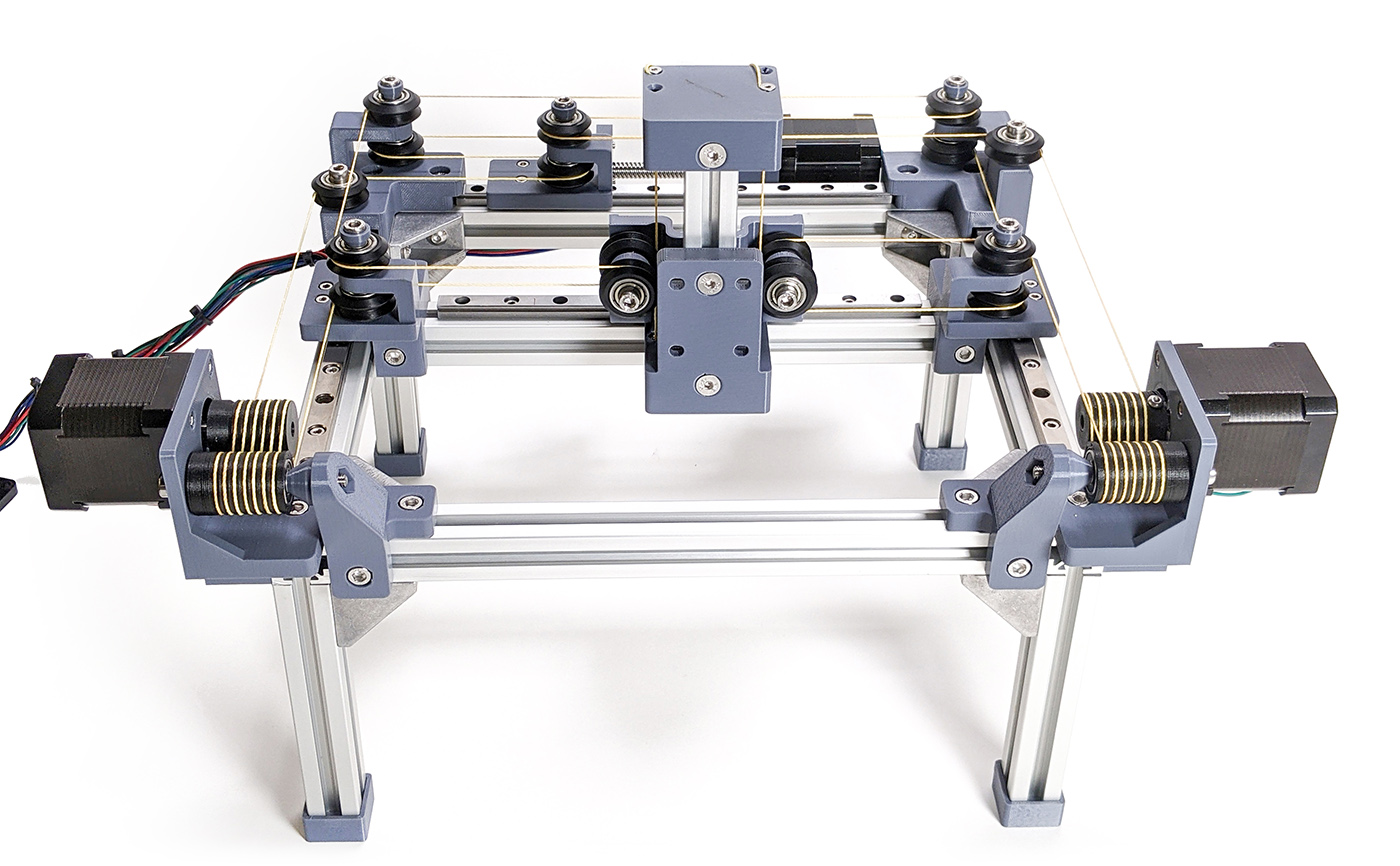 This is an ongoing project, but a proof-of-concept mechanism has been built to demonstrate the kinematics of CoreXYZ: